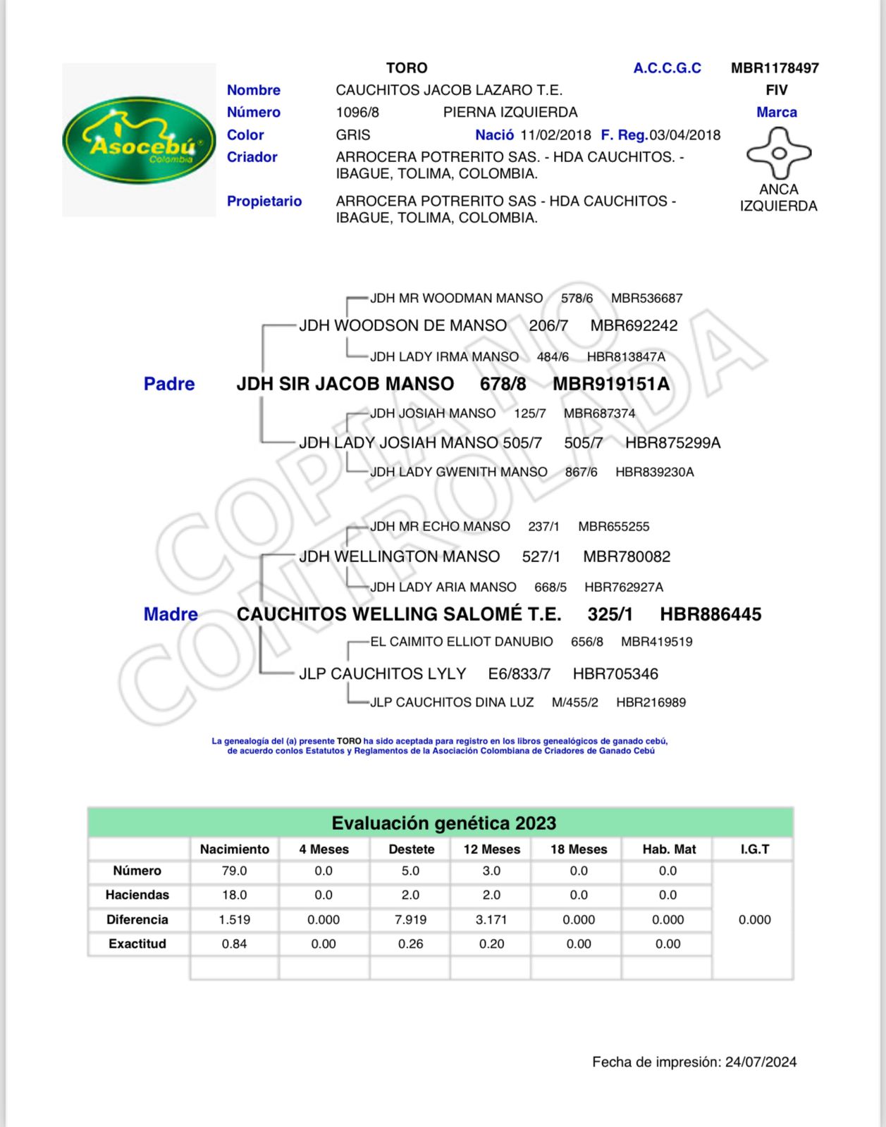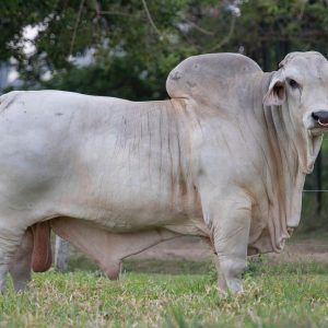 Un toro de buen tamaño, color gris claro, con muy buen pigmento de piel, un dorso largo, fuerte y amplio, con una estructura muy sobresaliente, amplio adelante y atrás, musculatura firme y abundante.