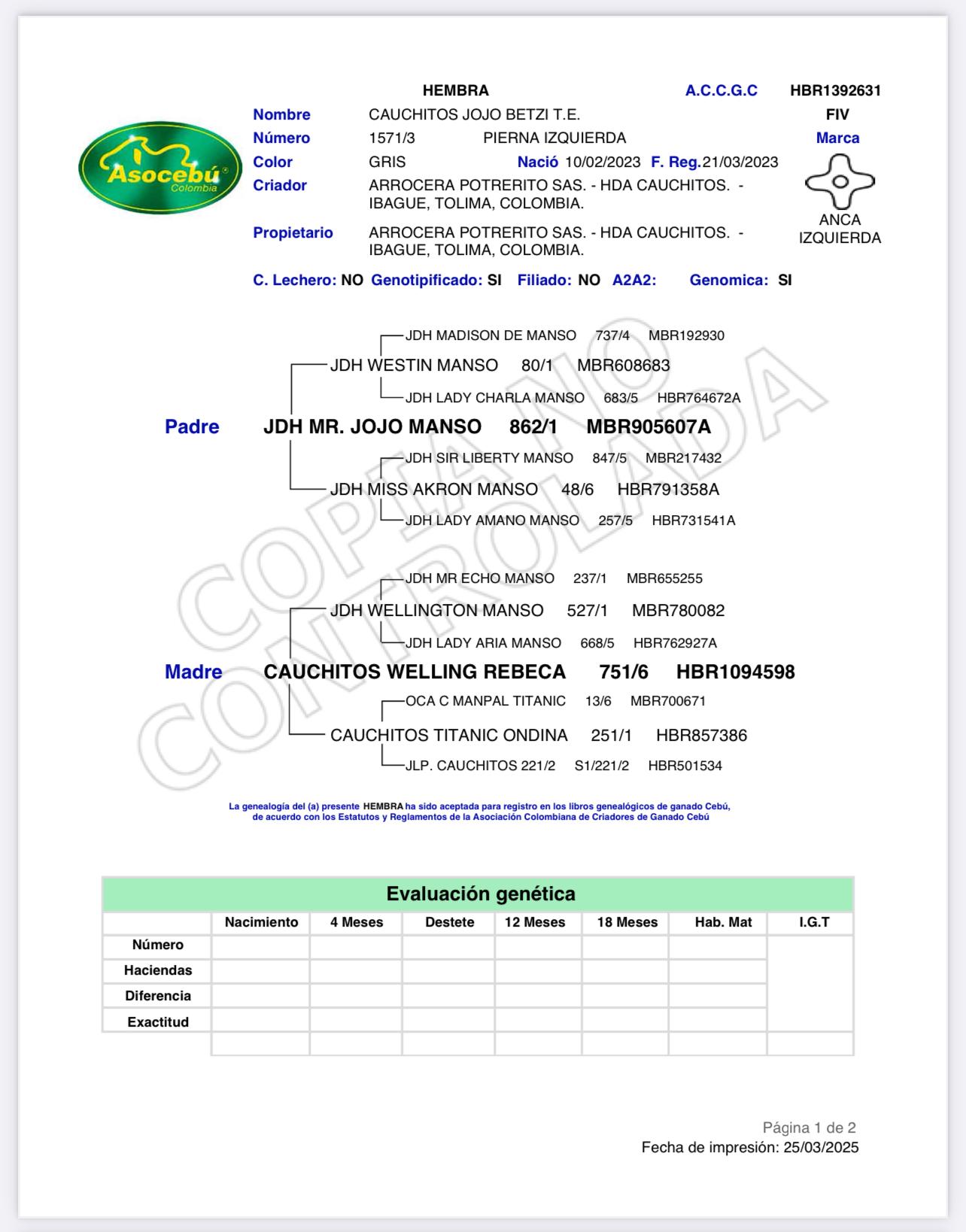 Es una novilla de excelente genética, preñada a sus 18 meses, muy femenina y de gran caracterización, de muy buen dorso, amplio y largo, bonita giba y bien implantada sobre sus hombros, de muy bonita ubre, buena pigmentación y fortaleza en sus aplomos.