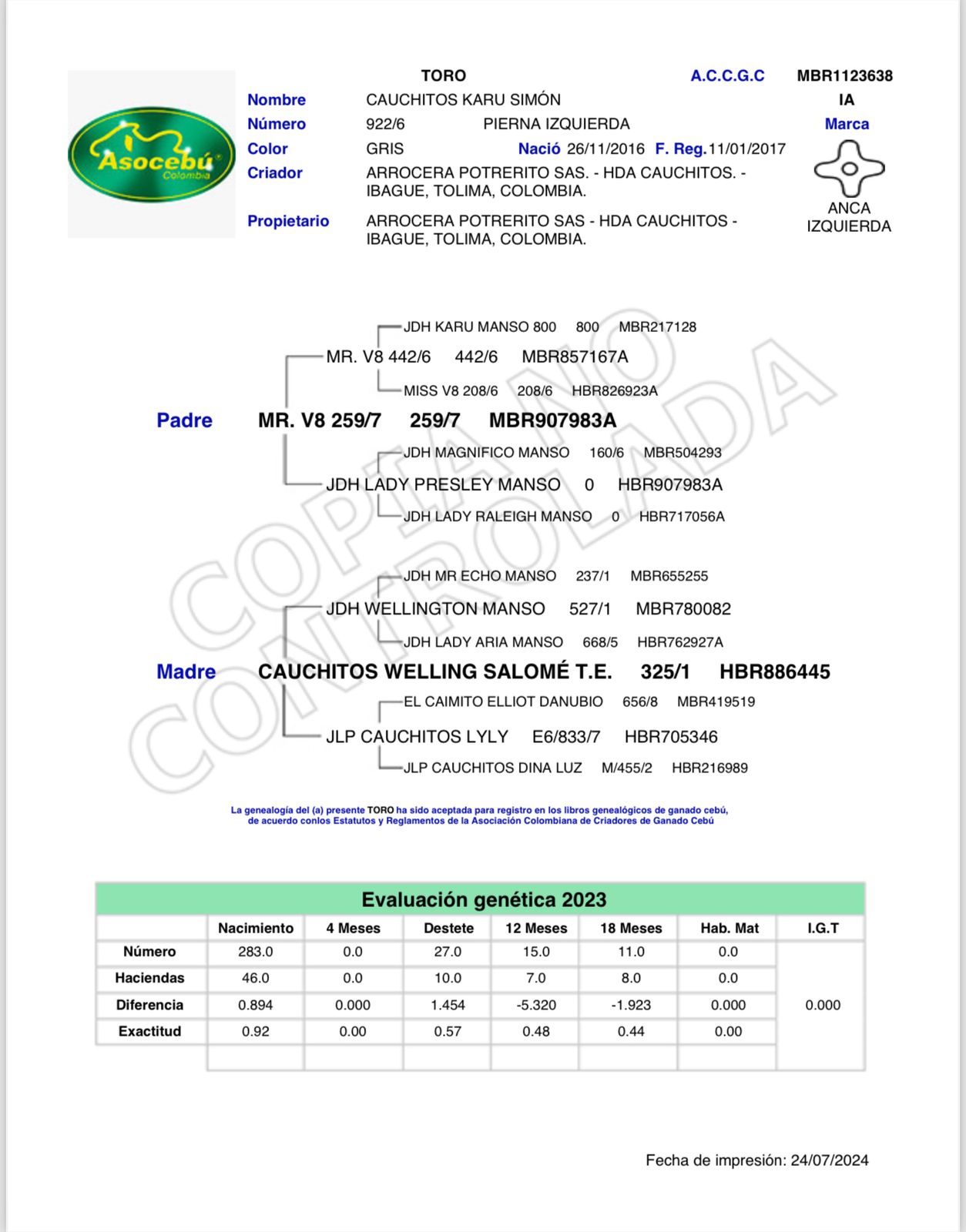 Es un toro muy sobresaliente, de muy buen tamaño y grandes características raciales, tiene una giba correcta y bien puesta sobres sus hombros, un lomo muy amplio rematando en un anca nivelada con un desprendimiento de cola suave, muy buenos aplomos delanteros y traseros, y un prepucio correcto.
