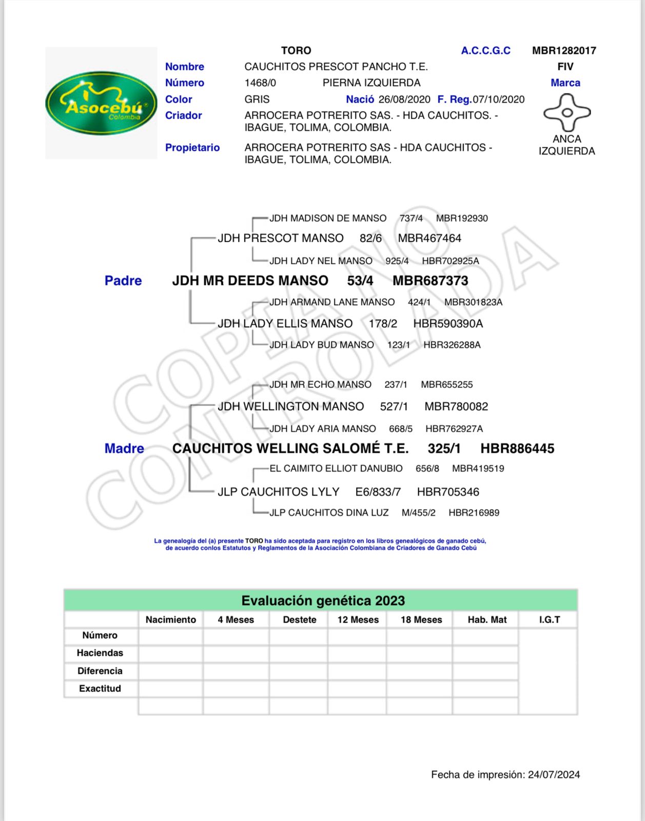 Es un toro talla media de mucho pigmento, gran caracterización racial, una giba correcta, bien implantada sobresaliente arco de costilla, muy largo de dorso y profundo en el tercio medio, de mucha estructura y excelente musculatura.