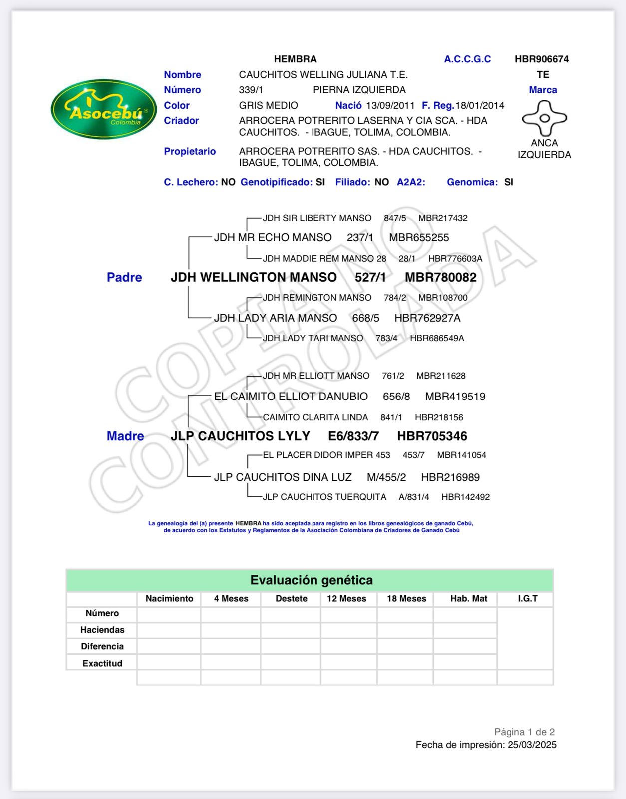 Es una vaca talla media, de excelente caracterización racial, muy profunda en tercio medio, amplia y larga en su dorso, de mucho volumen y excelente arco de costilla y estructura.