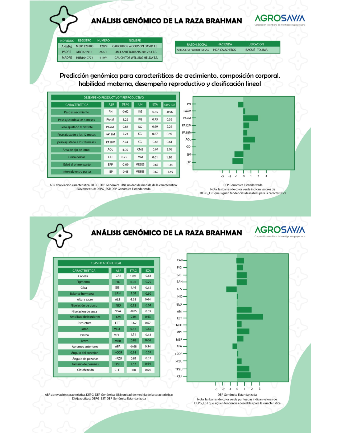 Es una vaca de excelente fenotipo, muy femenina, de mucha longitud y fortaleza en el dorso, de muy buenas masas musculares, excelente arco de costilla y capacidad, muy buena estructura y fuerte de aplomos.